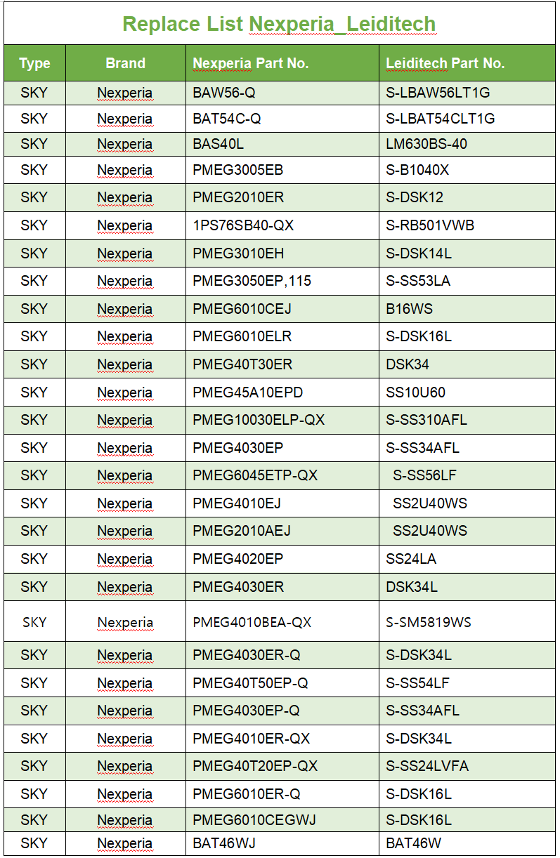l 雷卯替代Nexperia(安世)肖特基二極管(Schottky diode) 產(chǎn)品列表