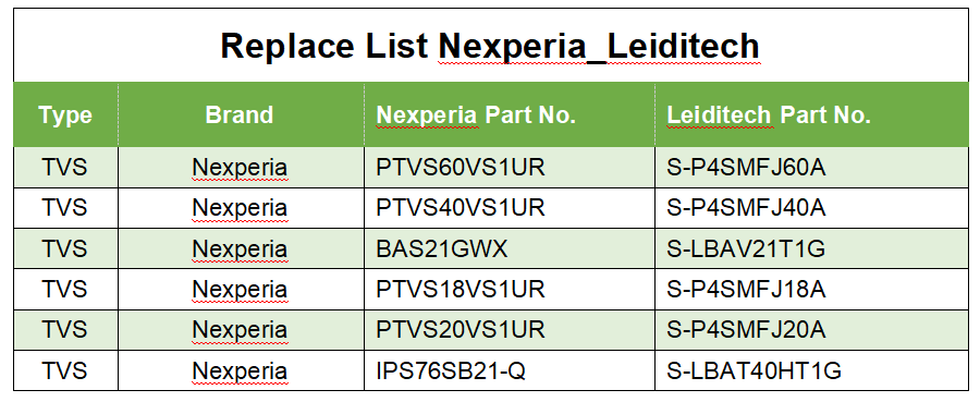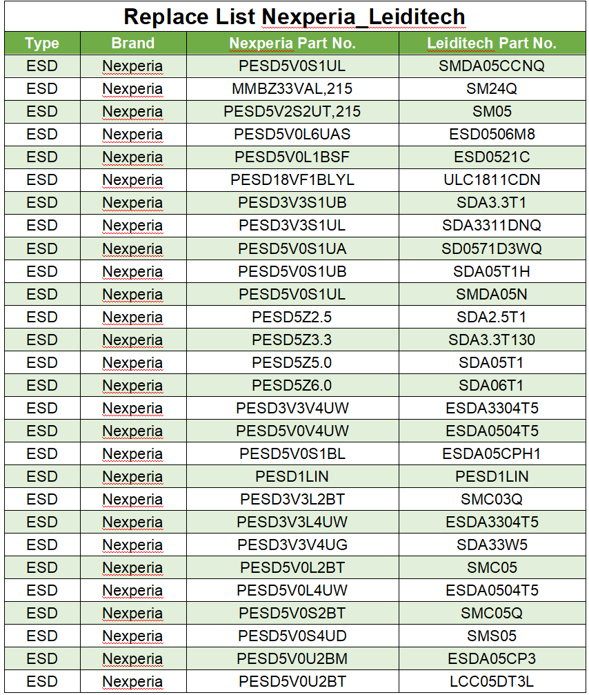 l 雷卯ESD二極管替代Nexperia 的ESD二極管替代表(列出部分型號(hào)):