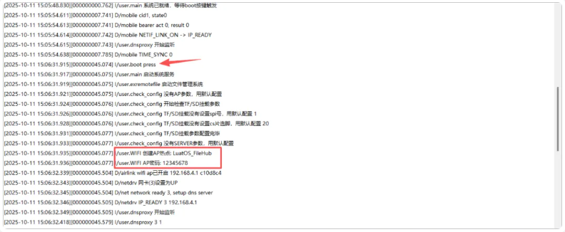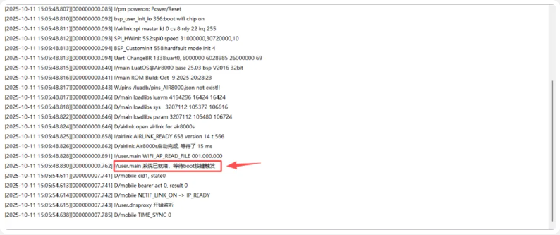 2)觀察串口日志,等待“系統(tǒng)已就緒,等待boot按鍵觸發(fā)”的提示: