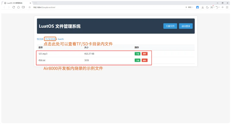 以Air8000開發(fā)板為例,通過簡單的配置和操作,可以快速將設(shè)備變?yōu)橐粋(gè)輕量級(jí)的文件服務(wù)器,用戶只需連接到設(shè)備創(chuàng)建的Wi-Fi熱點(diǎn),即可通過瀏覽器方便地瀏覽、管理和下載設(shè)備內(nèi)部存儲(chǔ)及SD卡中的文件。