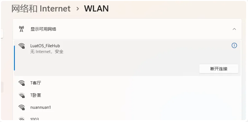 使用手機(jī)或電腦搜索并連接名為LuatOS_FileHub的Wi-Fi熱點(diǎn),密碼為12345678。