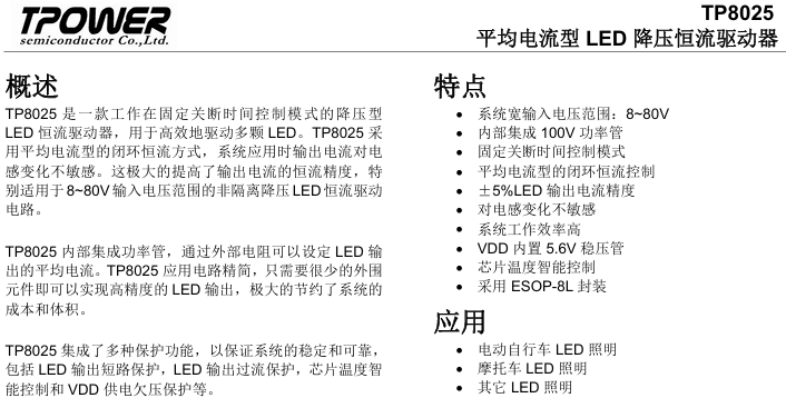 天源TP8025A 2.5A平均電流型 LED 降壓恒流車燈驅(qū)動器