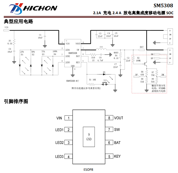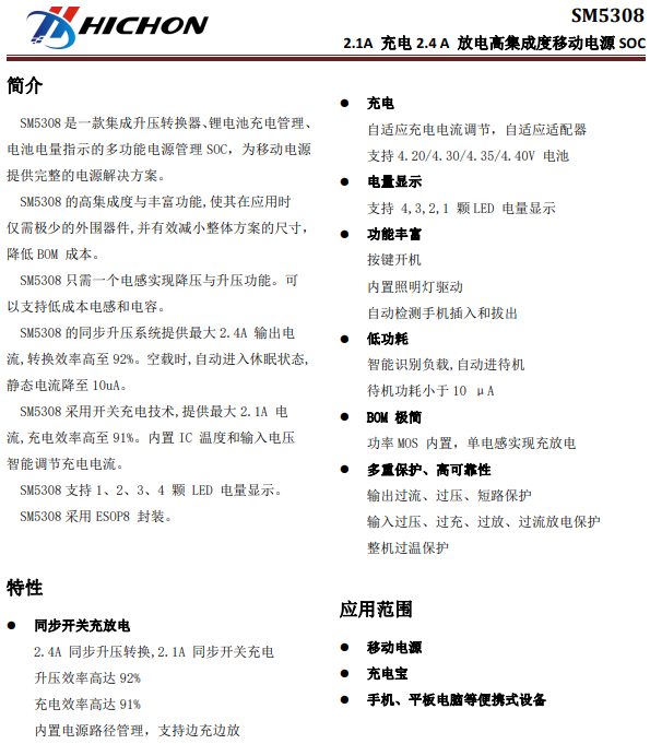 SM5308 2.1A高電流 是一款集成升壓轉(zhuǎn)換器、鋰電池充電管理、電池電量指示的多功能電源管理