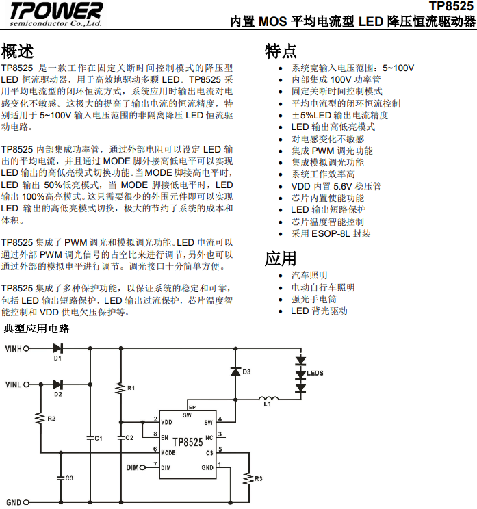 天源TP8525 2.5A平均電流型 LED 降壓恒流車燈IC