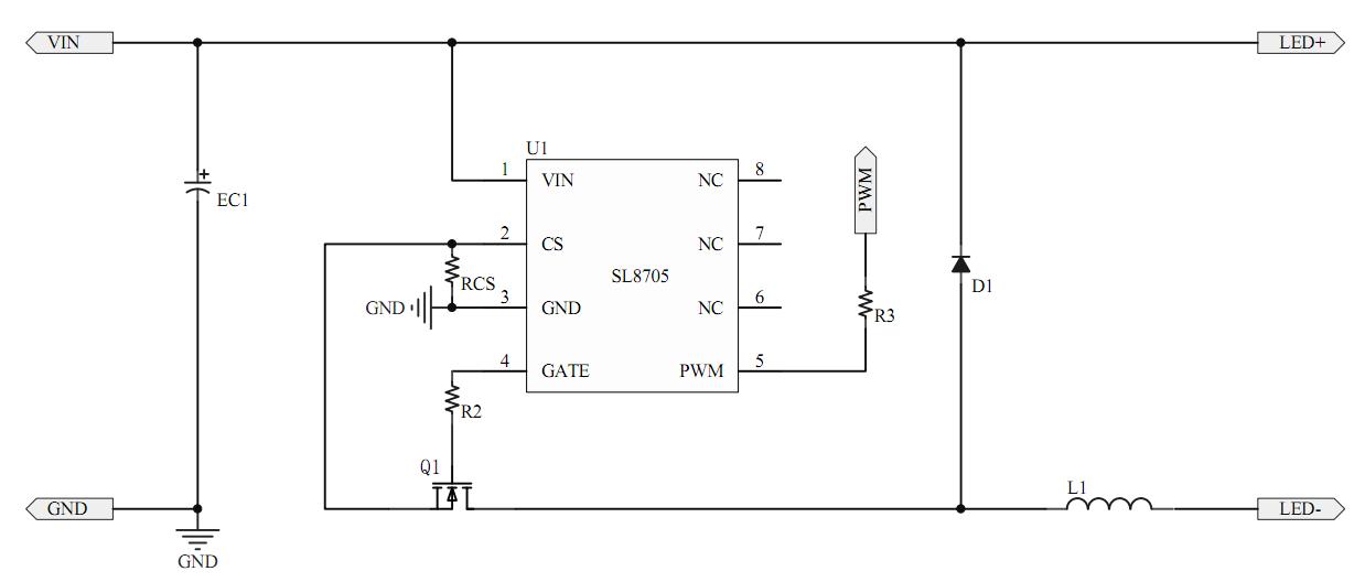 說明 SL8705 是一款外圍電路簡單的平均電流型 LED 恒流驅(qū)動器,適用于6-60V輸入電壓范圍的非隔離式 大功率降壓型恒流 LED 驅(qū)動領(lǐng)域。 SL8705 PWM 端口支持超小占空比的 PWM 調(diào)光,可響應 ...